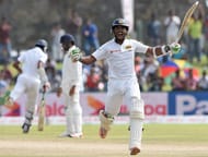 Dinesh Chandimal reacts as he reaches his hundred-ball century, the fastest score by a Sri Lankan against India.