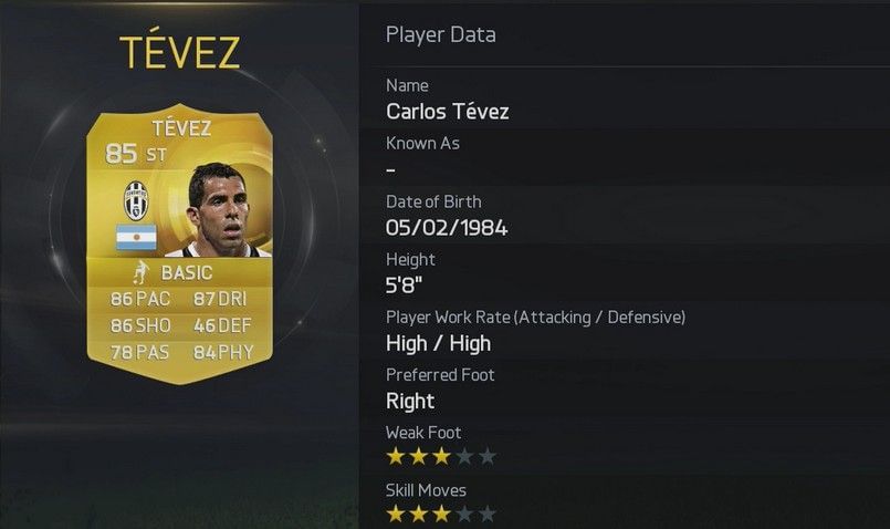 21 goals in 45 appearances for Juventus last season, Tevez finds himself out of reckoning for a spot in his national team. He drops one rating from FIFA 14 to be rated 85 in the new game. Since he is already 30, it is unlikely that he wll improve further in the game.