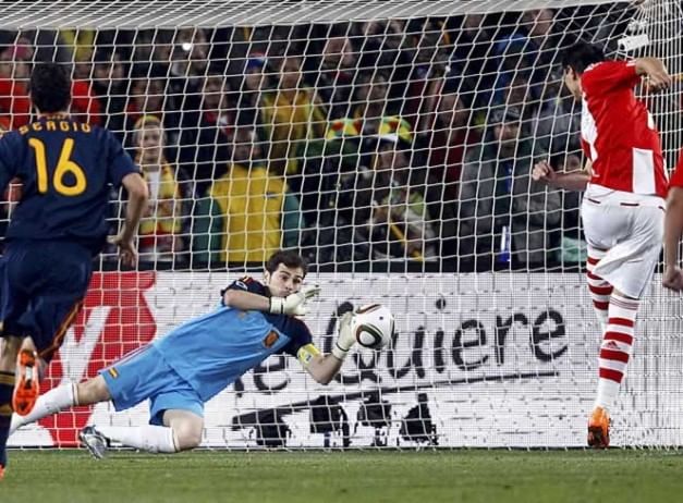 The Spanish attack put up a lacklustre show and an out-of-form Fernando Torres was substituted after only 56 minutes. Paraguay seemed the side more likely to score, but Casillas and the Spanish defence kept them quiet, until Gerard Pique conceded a penalty for a foul on Oscar Cardozo. With the score being 0-0 at that moment, and Spain looking unlikely to score, a goal at that stage would have pushed La Roja close to an unceremonious exit.