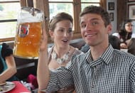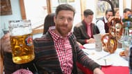 Bayern Munich midfielder Thomas Muller is seen raising the beer mug aloft, with his wife, Lisa Trede, looking on.