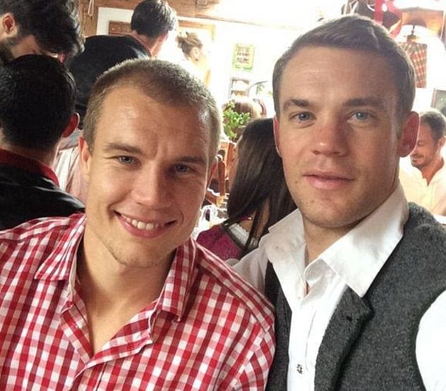 Shotstopper Manuel Neuer with centre-back Holger Badstuber, who is currently recuperating from a long term thigh injury.