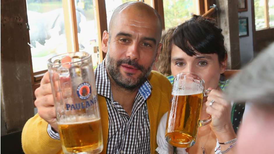 Bayern Munich boss Pep Guardiola having a great time as he barely acknowledges the camera, just as his wife Cristina Serra quaffs a pint of beer.