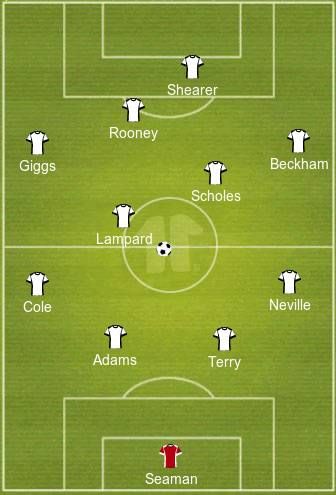 Substitutes: David James, Sol Campbell, Jamie Carragher, Steven Gerrard, Michael Carrick, Andrew Cole, Teddy Sheringham