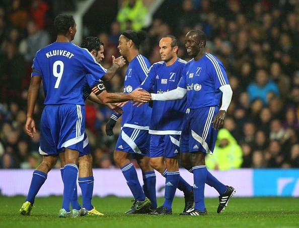While he has been relaxing post his Real Madrid tenure, Carlo Ancelotti made a comeback for this game to manage the Rest of the World XI. Here he is pictured with Dwight Yorke, Mikael Silvestre and Robert Pires.