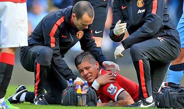 Manchester United’s Marcos Rojo is likely to be out of the side for at least six weeks – and possibly as long as six months – after suffering a shoulder injury against Manchester City.