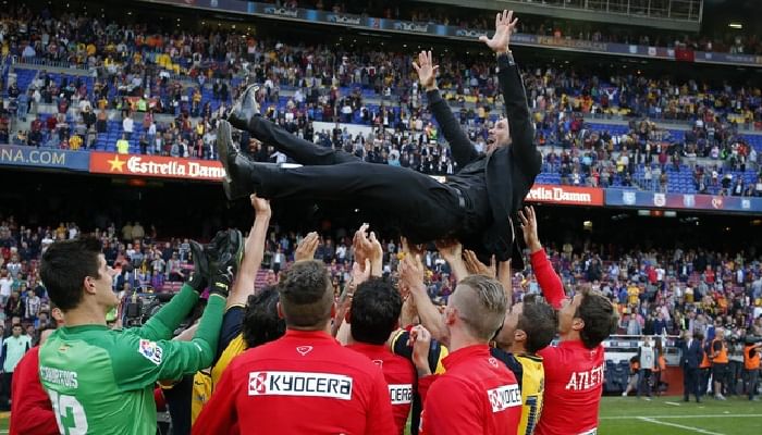 Atletico Madrid clinched their first La Liga title since 1996, battling back to draw with Barcelona and celebrate this most unlikely of triumphs on the Nou Camp pitch.