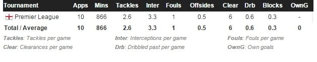 Looking at the the stats above, we can see that the Argentine has a good sense of positioning with atleast three key interceptions per game on an average.He possesses good composure on the ball by finding his own players more often than not with a high Pass success percentage of 87. Rojo has decent pace as well which has helped him quite often when he has been caught off guard.