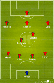 The team features 3 players from Bayern Munich, 4 players from Real Madrid, 2 from Barcelona and 1 each from Paris Saint-Germain and Manchester United.