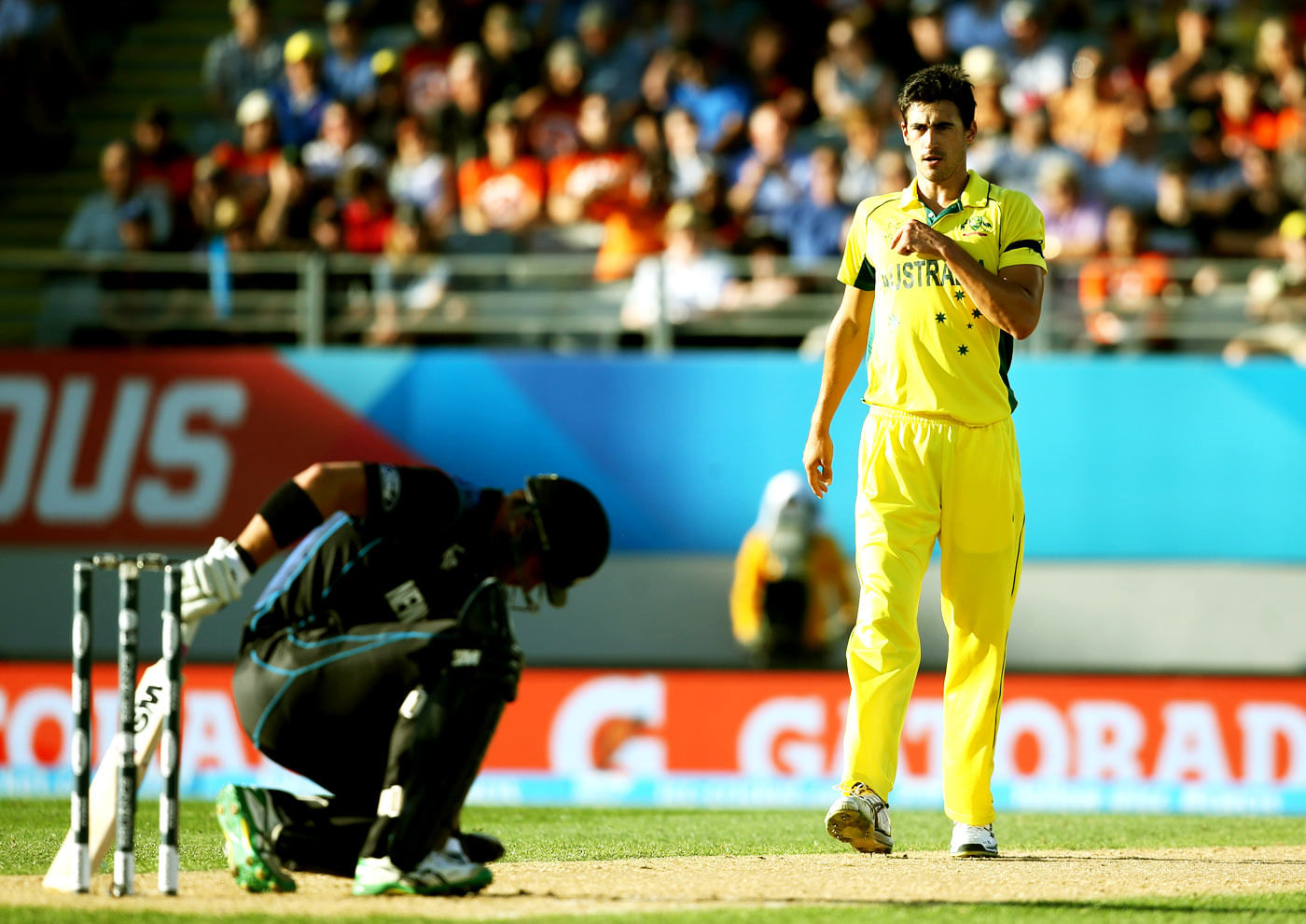 The wounded Kangaroos decided to hunt the Kiwis and capitalizing on the breakthrough before lunch, Mitchell Starc rattled the Kiwis batting line up by grabbing 6 wickets for just 28 runs. Guptill, Taylor, Elliot and Ronchi were his four key victims which eventually left the team stranded at 146-9. During his deadly wrath, Starc disturbed the timber four times.