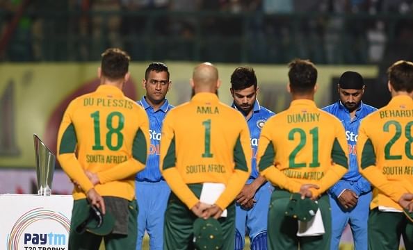 The Indian and South African players observe a minute’s silence as signal of respect to Jagmohan Dalmiya, India’s eminent cricket administrator, who passed away recently.