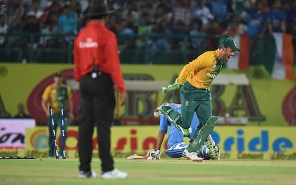 AB de Villiers celebrates in delight after running out India’s opener Shikhar Dhawan. The Delhi lad responded to Sharma’s call to attempt a double after a misfield but found himself marginally short of the crease.
