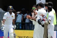 Sri Lankan cricketer Kumar Sangakkara (L) welcomed by Indian cricket players and his own teammates as he arrives to bat during the second day of the second Test at P Sara Stadium in Colombo.