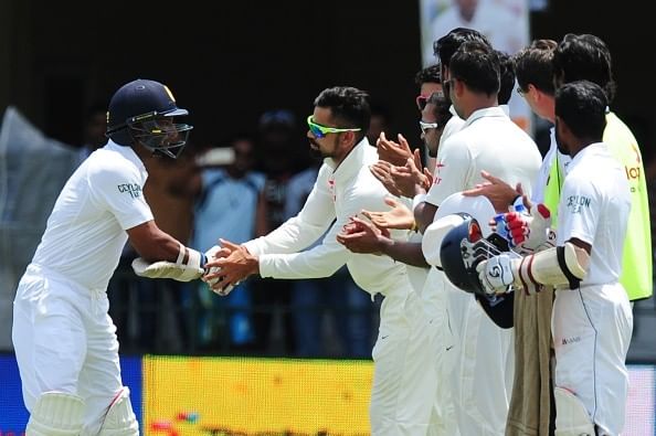 Kumar Sangakkara (L) is congratulated by Indian cricket captain Virat Kohli and teammates as he enters to play his farewell Test.