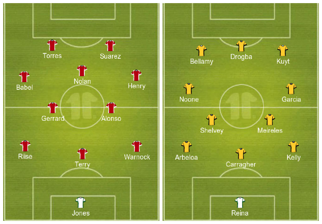 Steven Gerrard’s starting XI (left) vs. Jamie Carragher’s starting XI (right)
