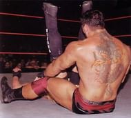 Randy’s tattoos mix well with the background on the poster. It’s said that Randy gets his tattoos touched up once a year. When Randy punches the floor before going for an RKO, the tattoos on the shoulders look great.