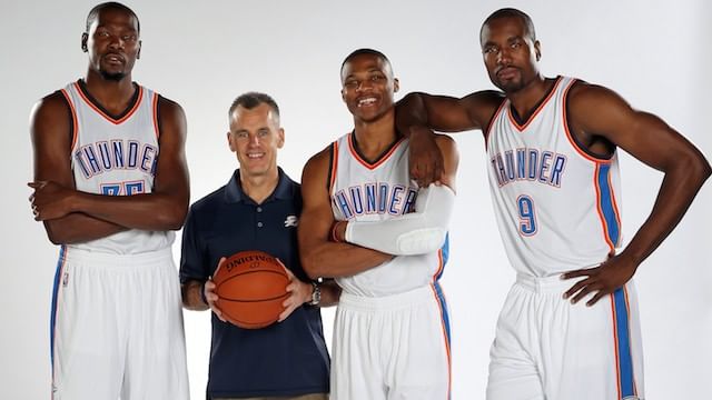 Russell Westbrook with Head Coach Donovan and now healthy teammates Durant and Ibaka
