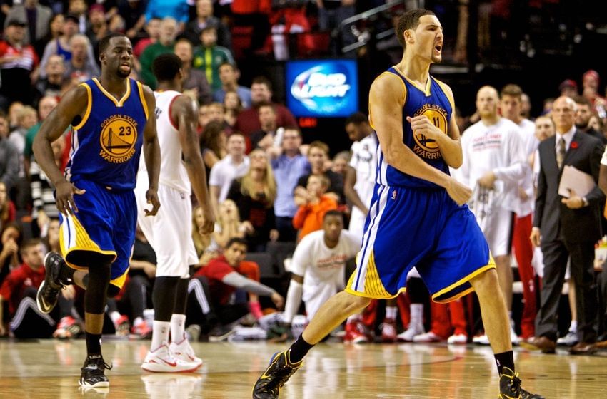 Klay Thompson celebrating a clutch basket against the Trailblazers.