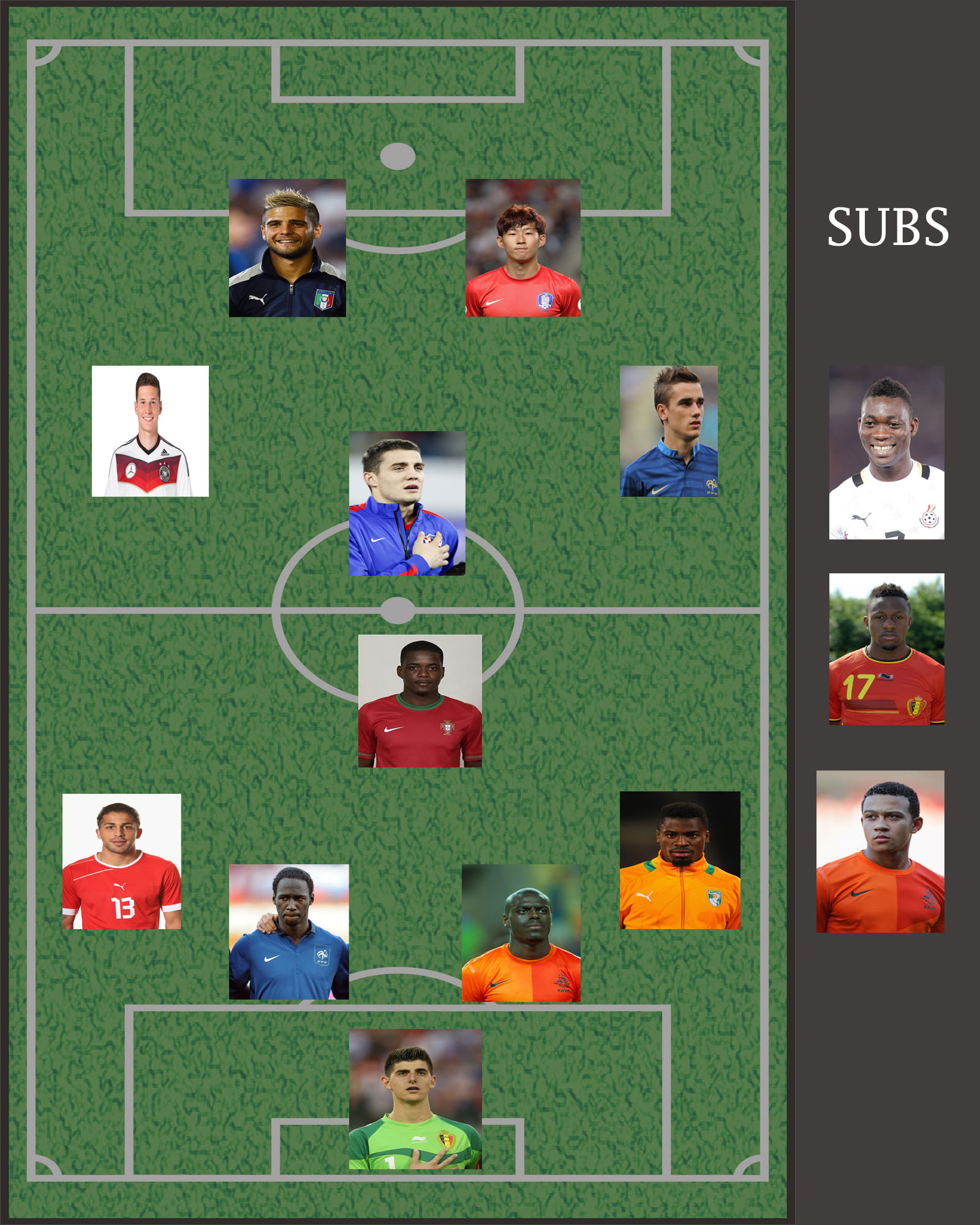 My team of the upcoming talents in world football . A lot of talents like Pogba , Varane , Koke etc are already playing for established clubs. Most of my picks are comparatively lesser known who will surely start a bidding war between top European Clubs !!