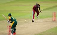 West Indies bowler Jason Holder bowls to South African batsman JP Duminy