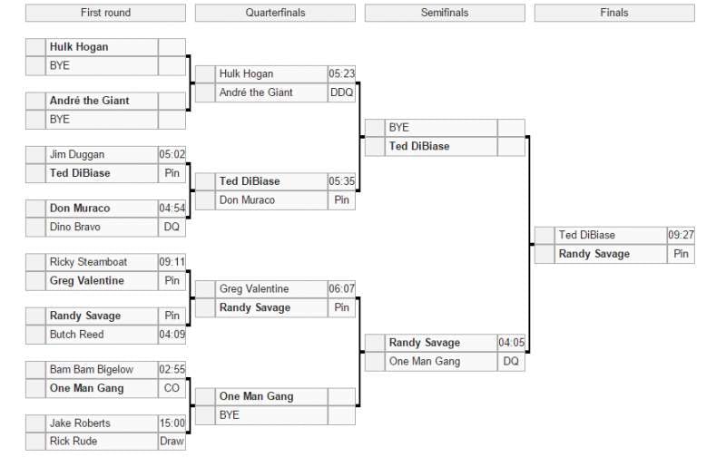 Ted DiBiase and Randy Savage were the finalists of the tournament. Savage was tired due to his hard-fought semi-final match with One Man Gang but DiBiase had an easy go and got a bye straight to the finals.