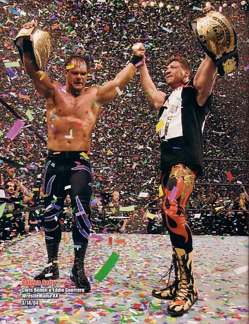 After the match, Eddie Guerrero and Benoit celebrated while confetti dropped for the emotional ending of WrestleMania XX.