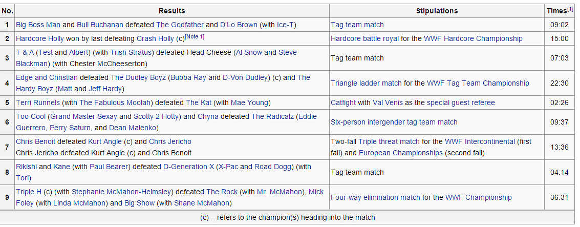 At WrestleMania XVI something peculiar happened. There was no one-on-one match in the entire PPV. The 9 scheduled matches were all tag matches, battle royal and fatal 4 way matches but there was no hint of a singles match.
