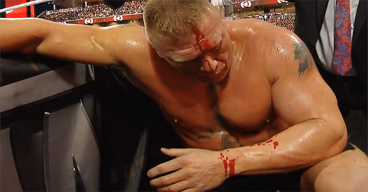 And once more, we have an entry as recently as WrestleMania XXXI. Brock Lesnar is legitimately one of the toughest guys in the WWE and we have seen the amount of pain Lesnar can handle. Remember the Shooting Star press botch and how he went on to finish despite a broken neck? That’s the Lesnar we know and honestly, a bit of blood shouldn’t be much for him.