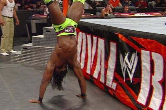 He made the best of a bad situation, though, and walked on his hands the entire way down the side of the ring to the stairs to avoid elimination. That also earned him the Slammy award for the top “Tell Me I Did Not Just See That” Moment of the Year.