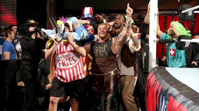 But at the time, Rose was still traveling with his Rosebuds party group, and Kofi landed on top of the dozen or so costumed characters. The Rosebuds toted him around the ring and placed him safely back on the apron, only to be eliminated a few moments later by Rusev.