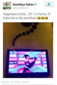 India would go on to play, and lose to the West Indies in the semi-finals, following which Mushfiqur tweeted to celebrate the loss.