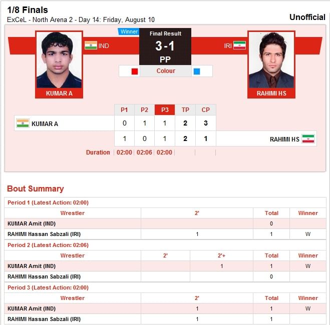 In the first round, Rahimi earned a point by pushing the Indian out of the ring. But Amit Kumar came back in the 2nd round to earn a point by take-down. The scores were tied till the dying moments of the last round when a take down by Amit Kumar earned him a narrow victory.