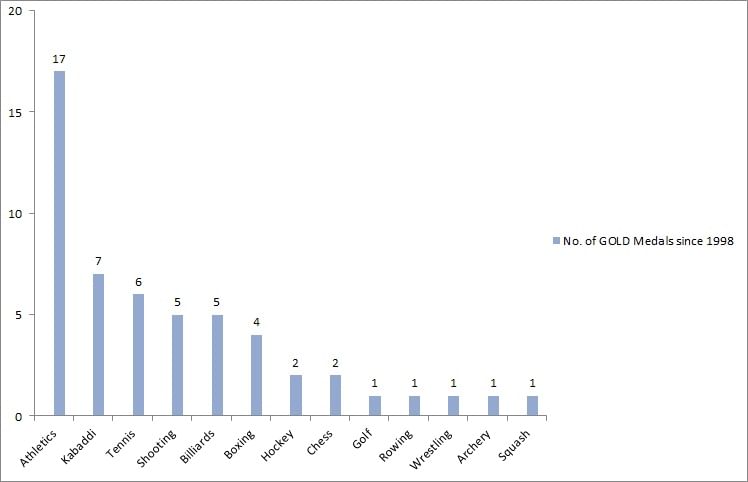 It is clear that the performance given by Indian athletes is improving in each Aisad, but, there is no improvement in the the overall ranking of India in the medals tally. At the same time, a bit more analysis shows that there is significant improvement in a numbes of disciplines in which India earned its glod medals. In 1998, India won its gold medals (7) across only five different disciplines (athletics, boxing, kabaddi, hockey and billiards) which has improved to 9 (athletics, boxing, kabaddi, hockey, shooting, squash, tennis, archery and wrestling) in the recently concluded 17th Asian games. The lesser count of Indian medals in Incheon can also be atrributed to exclusion of disciplines like chess and cue sports from this edition.