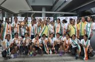 Players and support staff of Indian Women’s Junior Hockey team which won bronze medal at Junior Hockey World Cup pose with their medals after their arrival at the Indira Gandhi International Airport on August 6, 2013 in New Delhi, India. Indian girls scripted history at the seventh FIH Junior World Cup in Monchengladbach, Germany by beating England 3-2 in a penalty shootout in bronze medal play-off match on August 4 to finish on the podium.(Photo by Sushil Kumar/Hindustan Times via Getty Images)