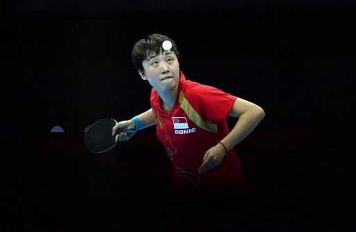 Singapore’s Feng Tianwei competes during the women’s team table tennis bronze medal match against South Korea at the London Olympics on August 7. Feng ended Singapore’s half-century wait for an individual medal with bronze in the women’s table tennis.