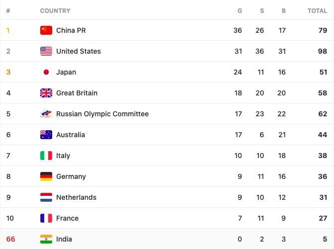With no medals today and five total in the bag, India has slipped to 66th place in the Tokyo Olympics medal tally. China leads the pack with 79 medals, including 36 gold. The USA closely follows with 31 gold and a total of 98 medals.