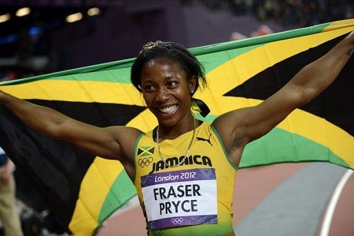 Jamaica’s Shelly-Ann Fraser-Pryce waves her national flag after winning the silver medal in the women’s 200m final at the athletics event of the London 2012 Olympic Games, on August 8. Fraser-Pryce finished with the personal best time of 22.09sec.