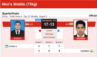 The third round was a complete mayhem with Vijender going for the broke. He lowered his guard and chased Atoev to the ropes at every possible opening. Atoev kept up a strong guard and took advantage of Vijender’s desperation to land in a few good rights. Vijender, running out of steam, gave it his all but missed quite a few straight punches which could have brought him back to level terms with the burly Uzbek. The Indian kept hitting the Atoev’s guard but a thumping right from Atoev sealed the game for him. The former world champion took the round 7-5 and the game by 17-13 points.