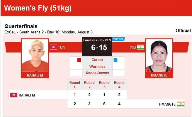 The fourth round was a mere formality as Mary went back to her previous strategy, leaving Rahali with no option but to attack from the first second. Rahali kept coming at the Manipuri boxer but she kept up her tight guard and took the sting out of her opponent. As Rahali started to tire, Mary Kom took the opportunity to extend her lead by landing two superb left hand jabs. Mary took the round 4-2 and the match by 15-6 points.