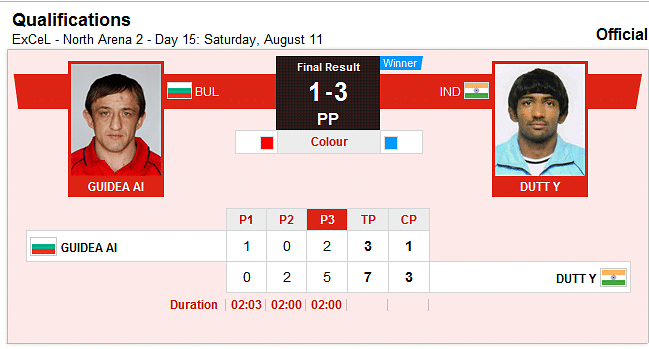 Round 3 began and it was do or die for the wrestler from Haryana. Out of nowhere, a series of moves occurred and both wrestlers found themselves on the mat. Guidea initiated the challenge but Dutt countered brilliantly to lead 3-2. 40 seconds away from the end of the final round, Yogeshwar won 2 more points to effectively seal the match.