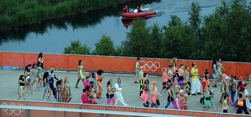 Performers walk toward the Olympic stadium before the start of the final rehearsal of the opening ceremony on July 25. The theme of the £27 million spectacular is “Isles of Wonder”, inspired by a passage from William Shakespeare’s play “The Tempest”.