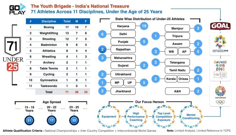 I have been able to identify 71 Athletes in the Under 25 age category in 11 Sports Disciplines. India has to find a way to groom & enable these individuals towards national sporting glory. This is captured below: