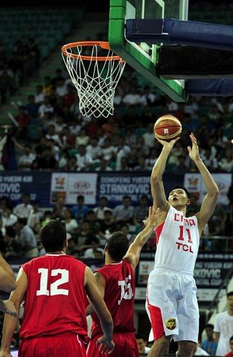 Yi Jianlian (right) of China takes a shot at goal against Tunisia during the Stankovic Cup basketball championship in Guangzhou, China, on July 6. Spanish NBA star Pau Gasol is confident his team can once again challenge the United States “Dream Team” for Olympic supremacy but he is cautious about the team’s opener Sunday against China, including star Yi.