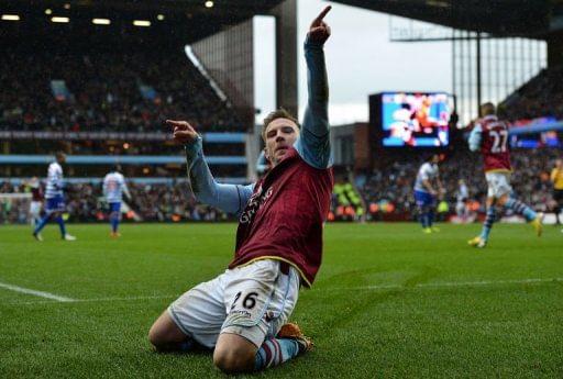 Aston Villa’s forward Andreas Weimann celebrates scoring during their English Premier League football match against Queens Park Rangers at Villa Park in Birmingham, central England, on March 16, 2013. Queens Park Rangers were left seven points adrift of safety at the foot of the table after losing 3-2 to relegation rivals Aston Villa in a thrilling encounter at Villa Park.