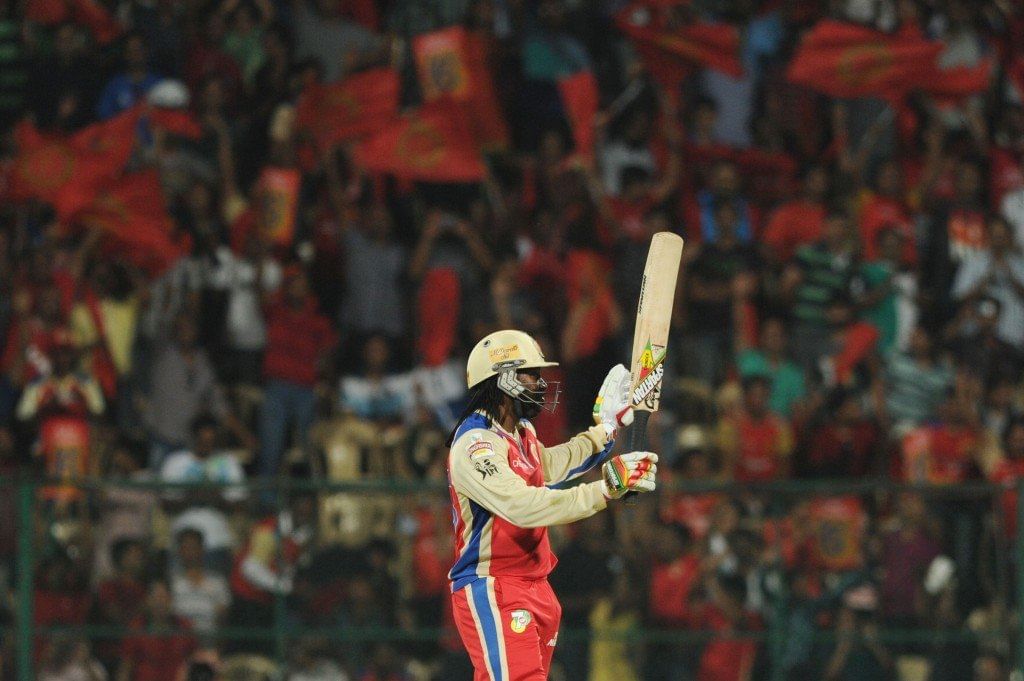 Chris Gayle (49 not out, 44b, 4×4, 1×6) guided Royal Challengers Bangalore through a mini-collapse as the hosts defeated Rajasthan Royals by seven wickets for their fifth win in seven outings and move to the top of the Pepsi IPL league table, here Saturday.
