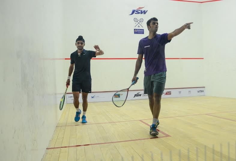 India teammates Harinderpal Sandhu and Mahesh Mangaonkar produced an intense and dramatic nail-biter which was the longest contest of the day at 75 minutes. It was the 2014 National Champion Harinder who got off to a better start. With his deft touches and wristy shots, he started taking pace off the ball to disrupt the rhythm of his 2014 Asian Games gold medal-winning teammate. Sandhu quickly took the first game 11-6.