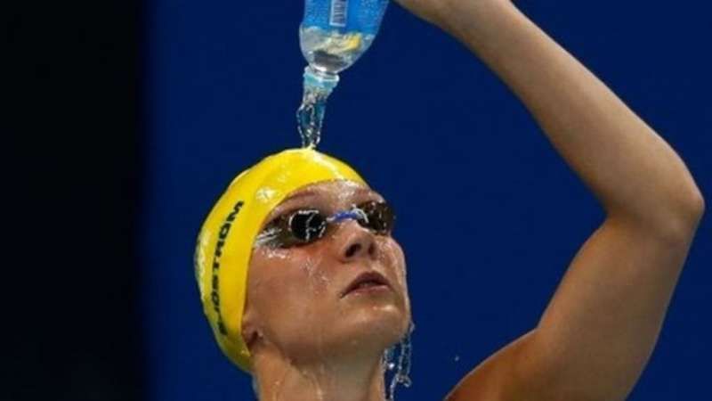 Katie Ledecky’s number one threat in the pool, Sjostrom acclimatises herself for a second time after the showers and before the race by upending a bottle on her cap.