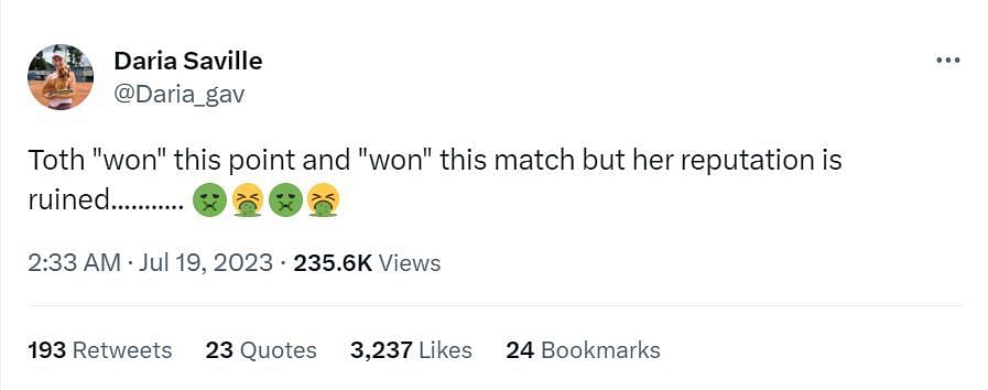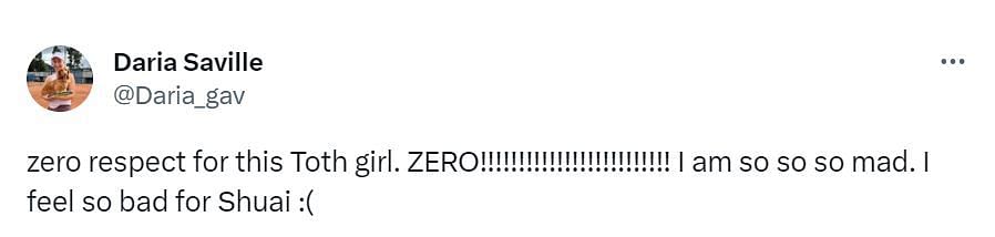 "Zero respect for this Toth girl. ZERO!!!!!!!!!!!!!!!!!!!!!!!!! I am so so so mad. I feel so bad for Shuai," Saville tweeted.
