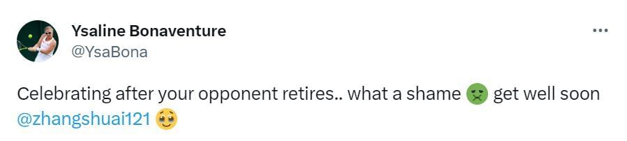 "Celebrating after your opponent retires...what a shame. Get well soon @zhangshuai121."