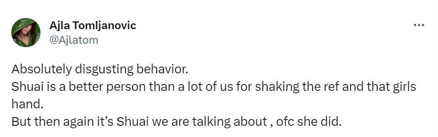 "Absolutely disgusting behavior. Shuai is a better person than a lot of us for shaking the ref and that girls hand. But then again it’s Shuai we are talking about, ofc she did," Tomljanovic wrote.