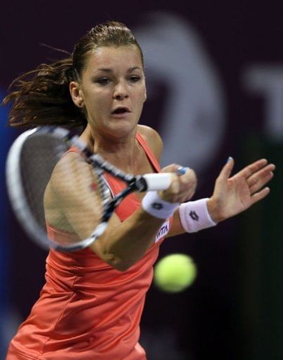 Agnieszka Radwanska of Poland returns the ball to Belarus Victoria Azarenka during their WTA Qatar Open semi-final tennis match on February 16, 2013 in the Qatari capital, Doha. Azarenka won 6-3, 6-3.